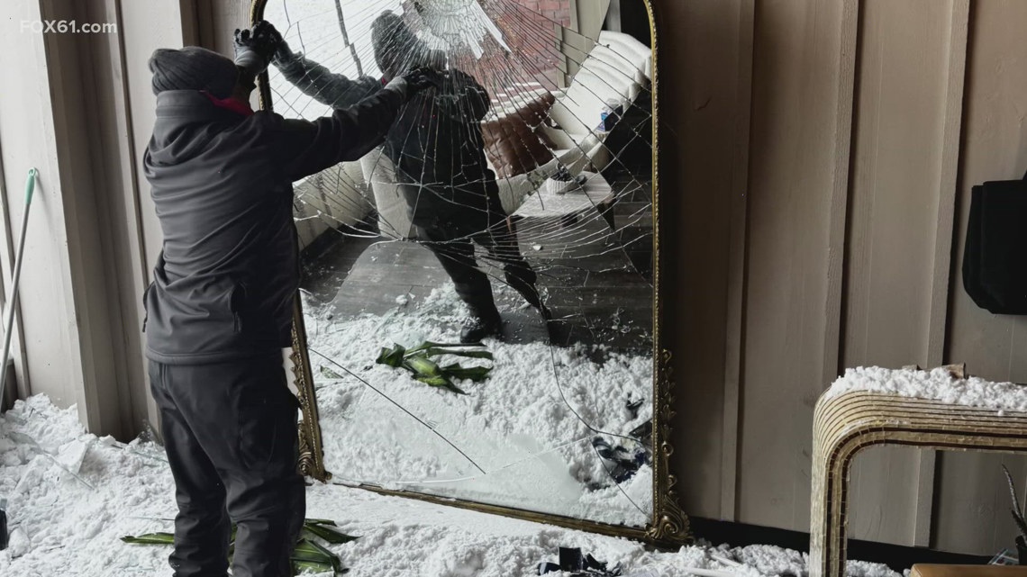 MIDDLETOWN, Conn. — The front window at Bareskin Beauty Bar in Middletown has been replaced, but shards of glass still line the sidewalk a visible reminder of the damage left behind after a recent snowstorm.
